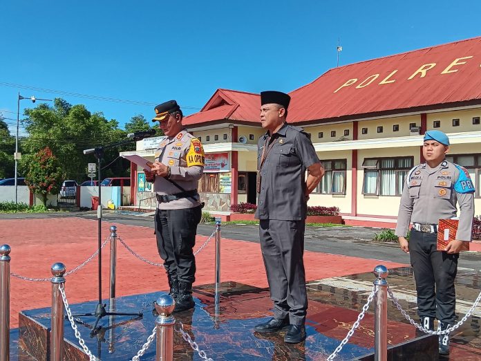 TOMOHON, Mileniumtimes.com – Wali Kota Caroll Senduk yang diwakili Sekretaris Daerah Kota (Sekdakot) Tomohon Edwin Roring menghadiri apel gelar pasukan serentak dalam rangka operasi kepolisian terpusat ‘Ketupat Samrat 2024’, di Lapangan Apel Polres Tomohon, Rabu (3/4/2024).