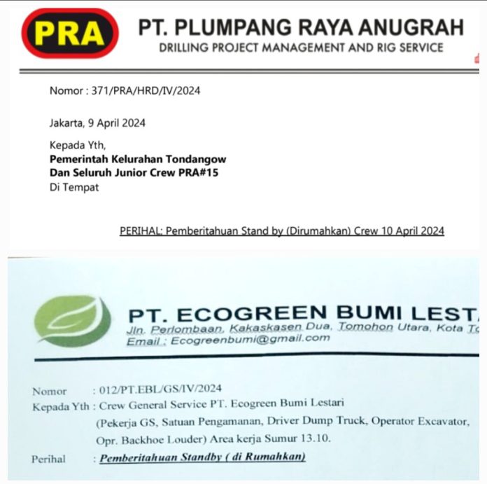 Surat serupa juga dilakukan oleh PT. Ecogreen Bumi Lestari yang berkantor di Tomohon Utara. Surat bernomor: 012/PT.EBL/GS/IV/2024, ditujukan kepada yang terhormat: Crew General Service PT. Ecogreen Bumi Lestari (Pekerja GS, Satuan Pengamanan, Driver Dump Truck, Operator Excavator, Opr. Backhoe Louder) Area kerja Sumur 13.10.