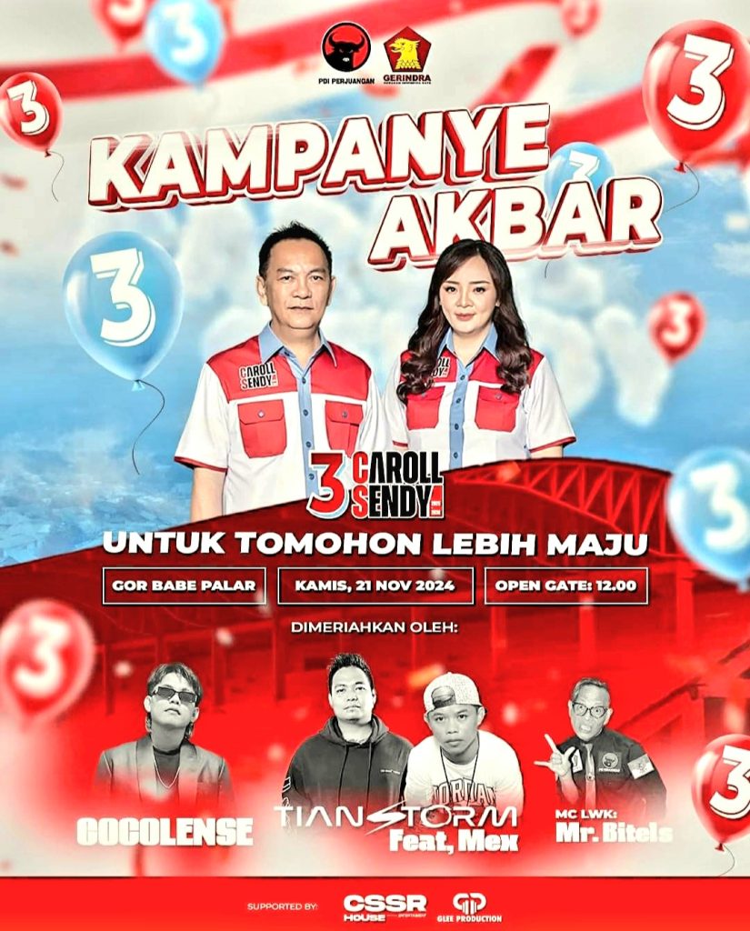 TOMOHON, Mileniumtimes.com— Puluhan Ribu pendukung dan simpatisan pasangan calon Wali Kota Tomohon dan Wakil Wali Kota nomor urut 3, Caroll Senduk-Sendy Rumajar (CSSR) bakal menjadi lautan massa di Lokasi Kampanye GOR dan Stadion Babe Palar, Walian Tomohon, Kamis (21/11/24).