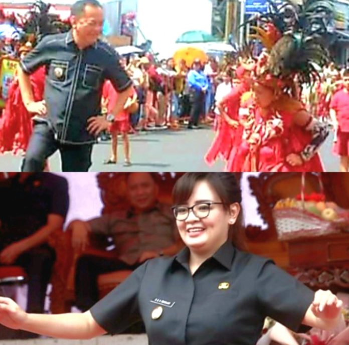 Ada yang menarik pada peragaan defile kali ini. Dua petinggi Kota Tomohon yakni Wali Kota Caroll Senduk dan Wakil Wali Kota Sendy Rumajar, keduanya melakukan ‘aksi’ simpatik.