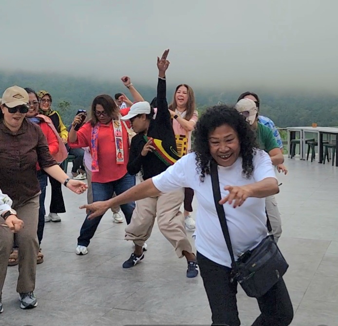 Tak berapa lama tiba, ibu-ibu IWAPI selain menikmati pesona Danau Linow, mereka beri kejutan, membuat para pengunjung terpukau saat mereka menari mengiringi suara sound membawakan tarian pergaulan populer asal Papua yakni; Yospan dan Sajojo.